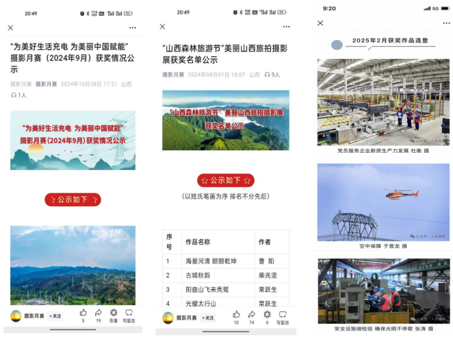 “電約拍”2.0項(xiàng)目實(shí)施以來(lái),重點(diǎn)培養(yǎng)團(tuán)隊(duì)成員17名,輻射帶動(dòng)80余名基層通訊員實(shí)戰(zhàn)能力提升,9名同志被山西攝影家協(xié)會(huì)吸收為會(huì)員。2024年,在人民日?qǐng)?bào)、新華社、山西電視臺(tái)、山西日?qǐng)?bào)、國(guó)家電網(wǎng)各類(lèi)媒體平臺(tái)發(fā)表圖片594幅、視頻報(bào)道335條,分別同比增長(zhǎng)430%、177%,宣傳績(jī)效得到有效提升,為企業(yè)高質(zhì)量發(fā)展?fàn)I造了良好的內(nèi)外部輿論環(huán)境?!半娂s拍”團(tuán)隊(duì)創(chuàng)作的《稻田喜事》《表里山河處處皆新色》等視頻作品獲得全國(guó)品牌故事大賽一等獎(jiǎng);短視頻“凌空一擊”全網(wǎng)點(diǎn)擊量超2億,評(píng)論、轉(zhuǎn)發(fā)次數(shù)過(guò)萬(wàn)。人民攝影報(bào)先后以三個(gè)整版對(duì)“光影筑夢(mèng) 點(diǎn)亮河?xùn)|”“與光同行 一路奮晉”“光影中的晉電力量”主題進(jìn)行圖文報(bào)道。