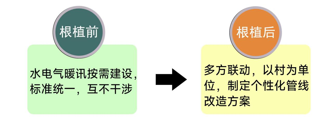 通過根植項目開展,政府“千萬工程”重點項目高質(zhì)量落地,在預(yù)期時間內(nèi)完成全部工作任務(wù)。公司農(nóng)村電網(wǎng)改造效率大幅提高,在7個村實現(xiàn)高壓線路不進(jìn)村,低壓線路全入地,最大限度降低管線外露帶來的安全隱患,為村民安全用電提供堅強的保障。對水電氣暖訊企業(yè)來說,通信線路、進(jìn)戶線實現(xiàn)全入槽,維修率大幅下降,為其節(jié)約了建設(shè)運維成本,管線覆蓋率達(dá)到100%,獲得更多潛在客戶。對村委來說,農(nóng)村面貌煥然一新,農(nóng)村政務(wù)服務(wù)水平全方位提高,鄉(xiāng)村人居環(huán)境更加宜居,村民生活品質(zhì)得到大大提升,人民有了更多幸福感。